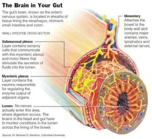 Cơ thể người có khoảng 100 triệu tế bào thần kinh kéo dài từ thực quản đến hậu môn hay còn gọi là hệ thần kinh ruột. “Bộ não thứ hai” này không có khả năng ý thức mà chịu trách nhiệm tiêu hóa và thậm chí là hơn thế. Nếu bạn đã từng cảm thấy lo lắng bồn chồn hoặc cảm thấy ấm ách ở ruột gan khi nghe tin xấu, nguyên nhân nằm ở hệ thống thần kinh ruột. Hệ thống thần kinh ruột cũng đóng vai trò trong hình thành tâm trạng nói chung và giải thích tại sao một số loại thực phẩm có thể giúp biến đổi tâm trạng và tại sao những tin xấu hay trạng thái cảm xúc tiêu cực khiến bạn mất đi cảm giác thèm ăn.