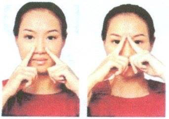 Dùng 2 ngón tay trỏ vuốt ngược từ chân 2 cánh mũi lên theo sườn mũi đến tận 2 đầu mày (30 lần). Sau đó dùng 2 ngón – ngón trỏ và ngón cái – chụm lại, vuốt xuôi sống mũi từ trên đầu mày xuống đầu mũi (30 lần).