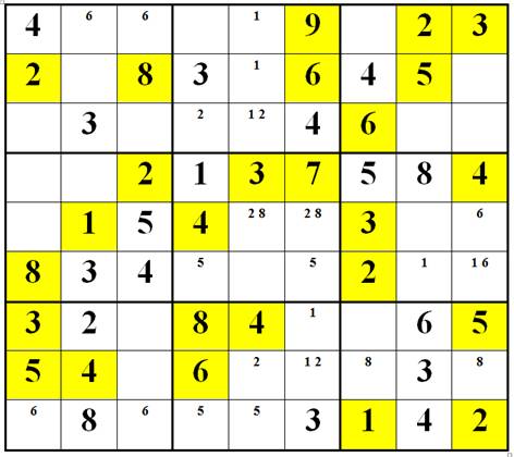 – Suy ra các số phải điền vào các ô, các trị khả dụng đầu tiên,