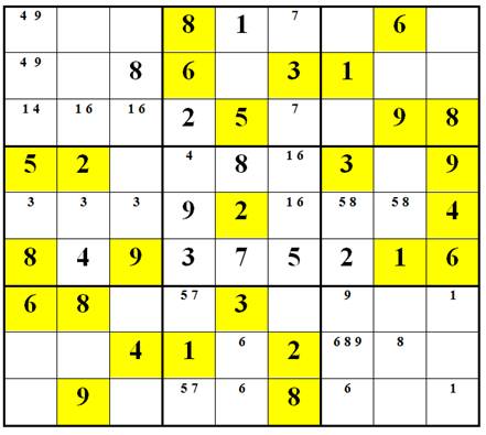 => D8 = 7, D3(1,6) D6(1,6) là 1 bộ 2 ô Sudoku trị 1 và 6 trên hàng D.