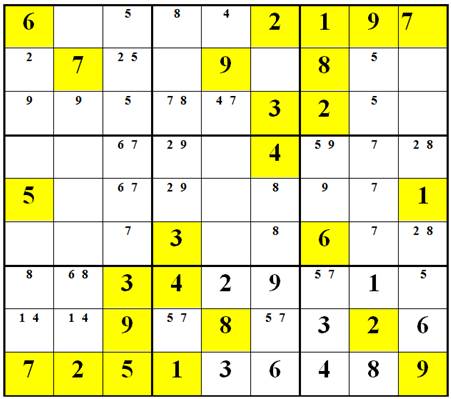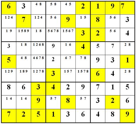 – Suy ra các số phải điền vào các ô, các trị khả dụng đầu tiên, các bộ 2 ô Sudoku nếu có.
