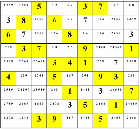 – Suy ra các số phải điền vào các ô, các trị khả dụng đầu tiên, các bộ 2 ô Sudoku nếu có.