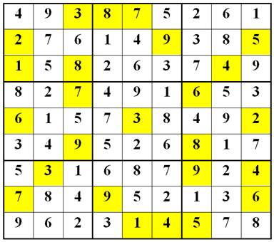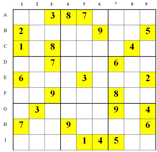 Khối 3 có bộ 3 ô Sudoku A9(1,9), B7(1,3), C9(3,9) trị 1, 3 và 9 => A7 = 2
