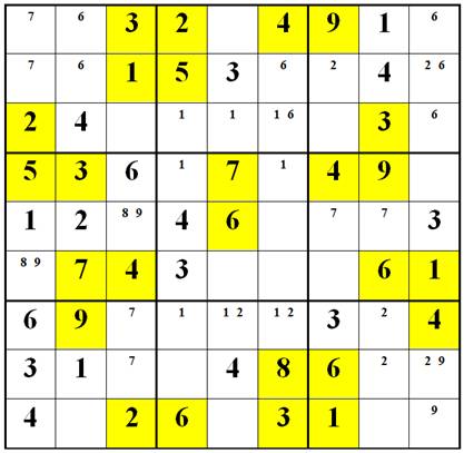 – Suy ra các số phải điền vào các ô, các trị khả dụng đầu tiên, các bộ 2 ô Sudoku nếu có.