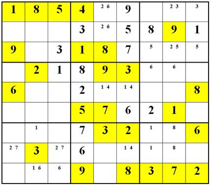 – Suy ra các số phải điền vào các ô, các trị khả dụng đầu tiên, các bộ 2 ô Sudoku nếu có.