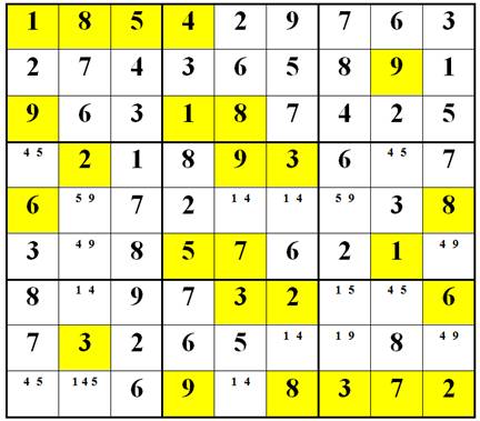Cột 1 có bộ 2 ô Sudoku D1(4,5) I1(4,5) trị 4 và 5 => G1 = 8 => H8 = 8, F3 = 8