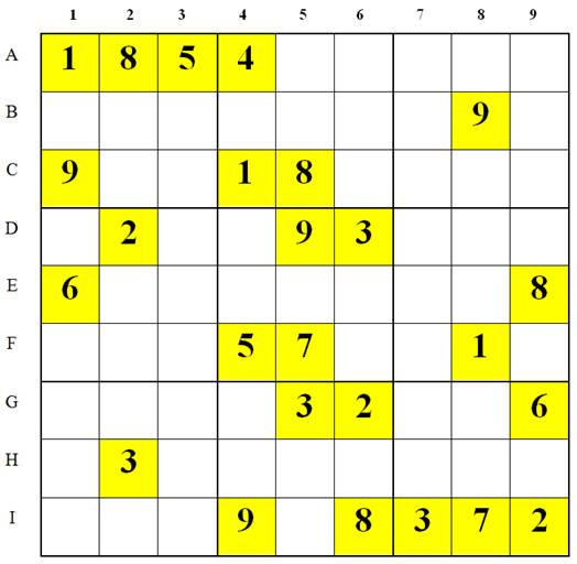 => H9 = 9 => H7 = 1 => H6 = 4 => I5 = 1 => E5 = 4 => E6 = 1