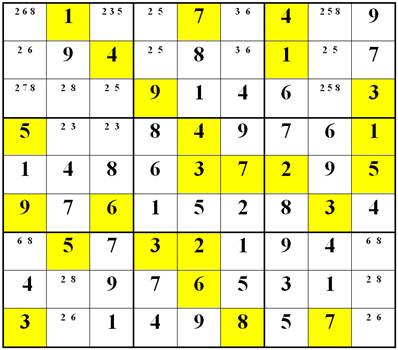 – Suy ra các số phải điền vào các ô, các trị khả dụng đầu tiên, các bộ 2 ô Sudoku nếu có.
