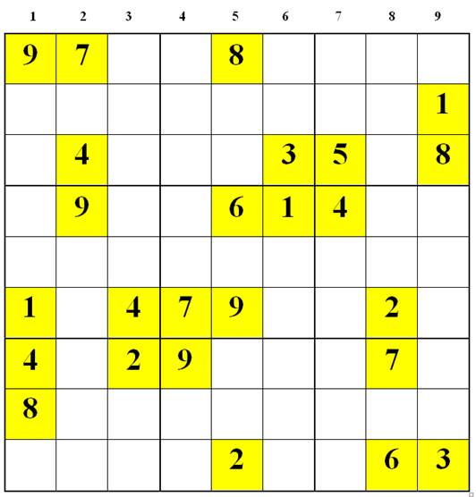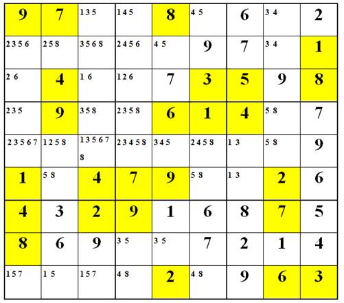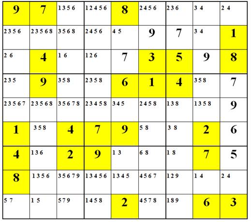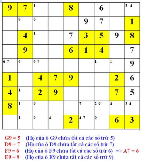 – Suy ra các số phải điền vào các ô, các trị khả dụng đầu tiên, các
