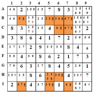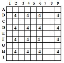 Trong hình trên, các ô trống trên 4 cột 2, 4, 6 và 9 , ngoại trừ các ô khẳng định khộng thể có 4 là một trị khả dụng.