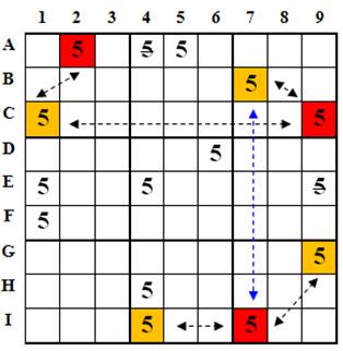 Hình cho thấy nhiều cặp ô khẳng định với trị khẳng định 5 trên các hàng như C, G, các cột như 1, 7 và khối 1, 3, 7 và 9.