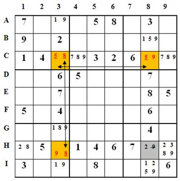 =>   Ô H8(2,9) có họ chứa C8 và H3 nên 9 có thể loại khỏi danh sách trị khả dụng
