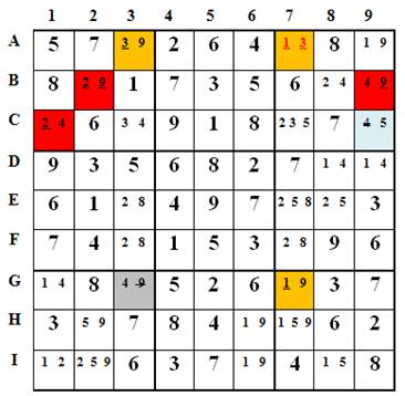 Hai ô G7(1,9) và A3(3,9) có liên hệ gián tiếp qua trtị khả dụng 9