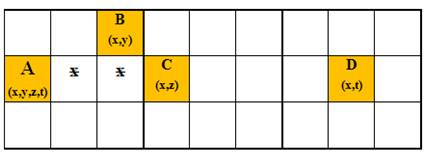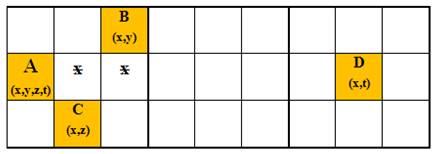 Thí dụ 1: Cánh-WXYZ có 2 ô A(x,y,z,t) và B(x,y) cùng nằm trong khối 1, 3 ô