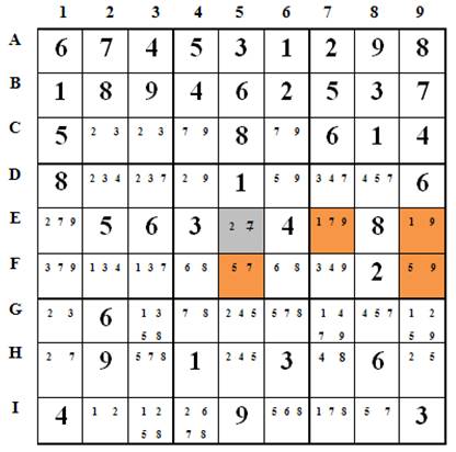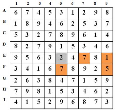 Ô E7(1,7,9) có 3 trị khả dụng 1, 7 và 9.