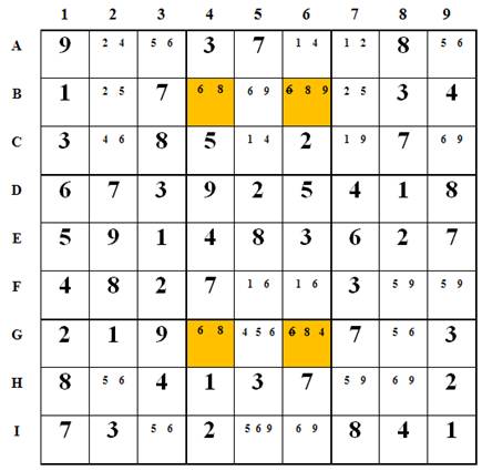 Hai ô ở nóc A9 và E9 cùng với C9 có tính chất như là một bộ 2 ô Sudoku trị 3, 8 mà một ô C9(3,8) và ô còn lại là 2 ô ở nóc A9(4,5,3) và E9(4,5,8).
