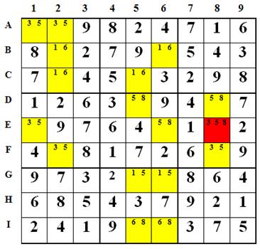 Trong khung Sudoku trên, tất cả các ô trống đều có 2 trị khả dụng trừ ô E8 có 3 trị khả dụng 3, 5 và 8.