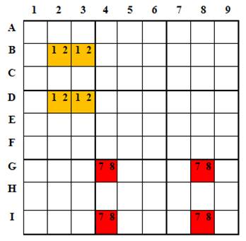 Hai hình chữ nhật B2B3D3D2 hợp bởi 4 ô có cùng trị khả dụng 1 và 2 và hình chữ nhật G4G8I8I4 hợp bởi 4 ô có cùng trị khả dụng 7 và 8 là những hình chữ nhật không giải được.