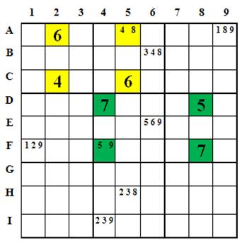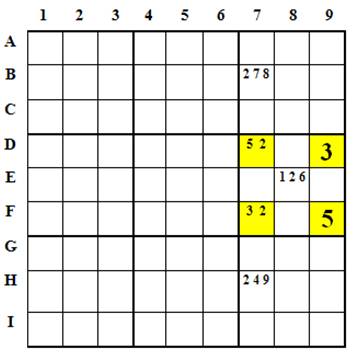 9 không thể là trị khả dụng của các ô trống trong hàng F, cột 4 và khối 5