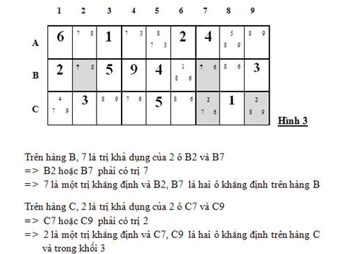 Trong Hình 3, các ô A2(7,8), A4(3,7) và A5(3,7,8) là một bộ ba với trị 3, 7 và 8 trên hàng A.