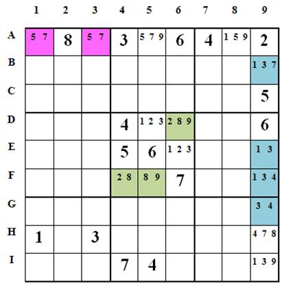 Thí dụ: Hai ô A1(5,7) và A3(5,7) là một bộ 2 ô Sudoku trị 5, 7 trên hàng A và trong khối 1 => 5 và 7 không thể là trị khả dụng của các ô khác trên hàng A => A5 = 9 => A8 = 1