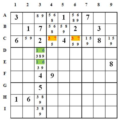 C4(3,7), C6(3,7) là một bộ 2 ô Sudoku ẩn của hàng C và khối 2
