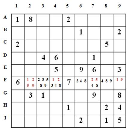 Loại 1, 2, 5, 9 khỏi các ô còn lại của hàng F: = > F3(3,8), F8(4,8)