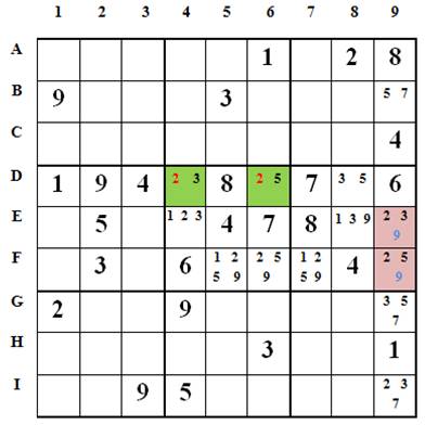 b) Trên cột 9, E9(2,3,9) và F9(2,5,9) là một cặp 2 ô khẳng định với trị khẳng định 9