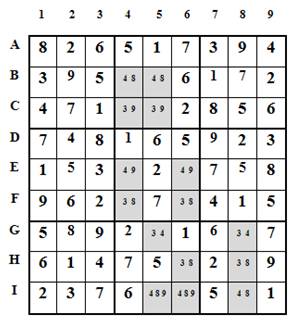 Chú thích: Dấu ‘+’ và ‘-‘ có thể thêm vào các trị tạm của 2 chuỗi điền số để phân biệt 2 chuỗi đó. Trị tạm thời có cả 2 dấu ‘+’ và ‘-‘ của một ô chính là trị thật sự của