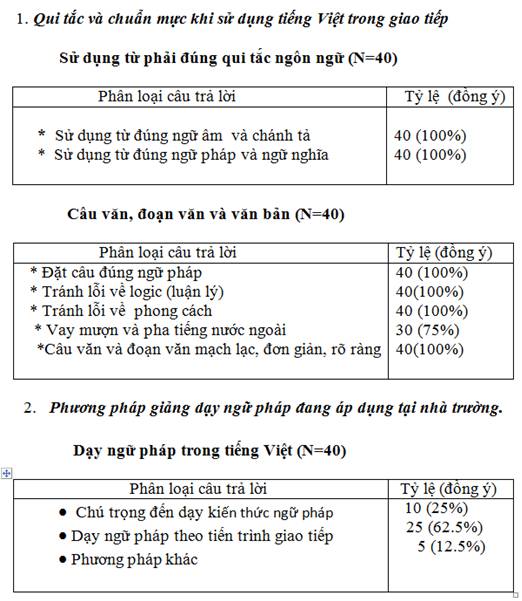 Các giáo viên được phỏng vấn và trả lời bảng tham khảo (survey) về chuẩn mực và qui tắc căn bản trong tiếng Việt mà học sinh cần phải được rèn luyện để tránh những lỗi khi giao tiếp, và phương pháp giảng dạy ngữ pháp đang áp dụng tại nhà trường.